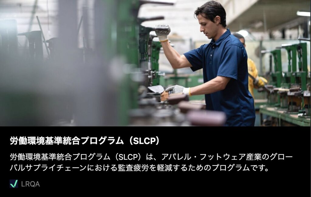 SLCP(労働環境基準統合プログラム)は、非営利の複数の利害関係者が参加するイニシアチブで、社会的評価に関する業界の協力を促進することにより、グローバル・サプライ・チェーンにおける監査疲弊を軽減し、改善行動に振り向けるためのリソースを確保することを目的としています。